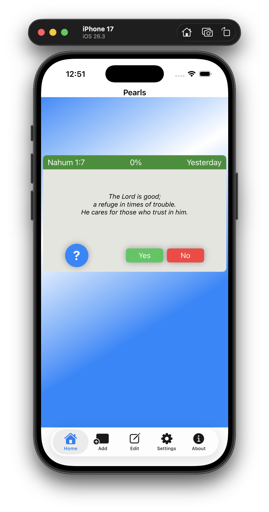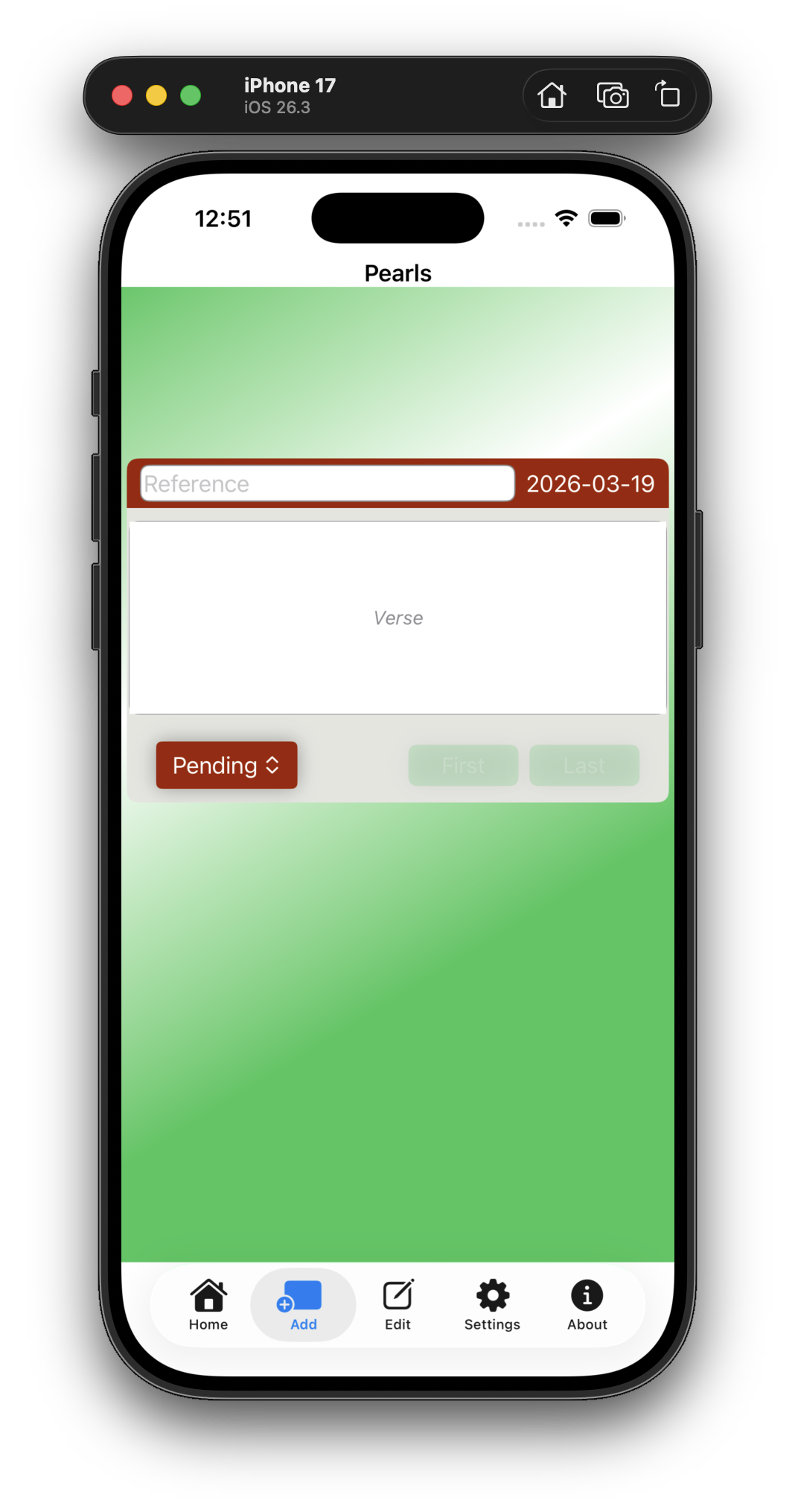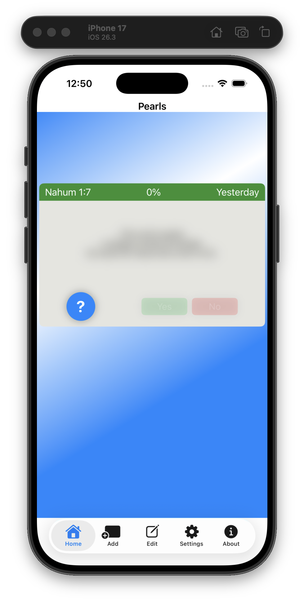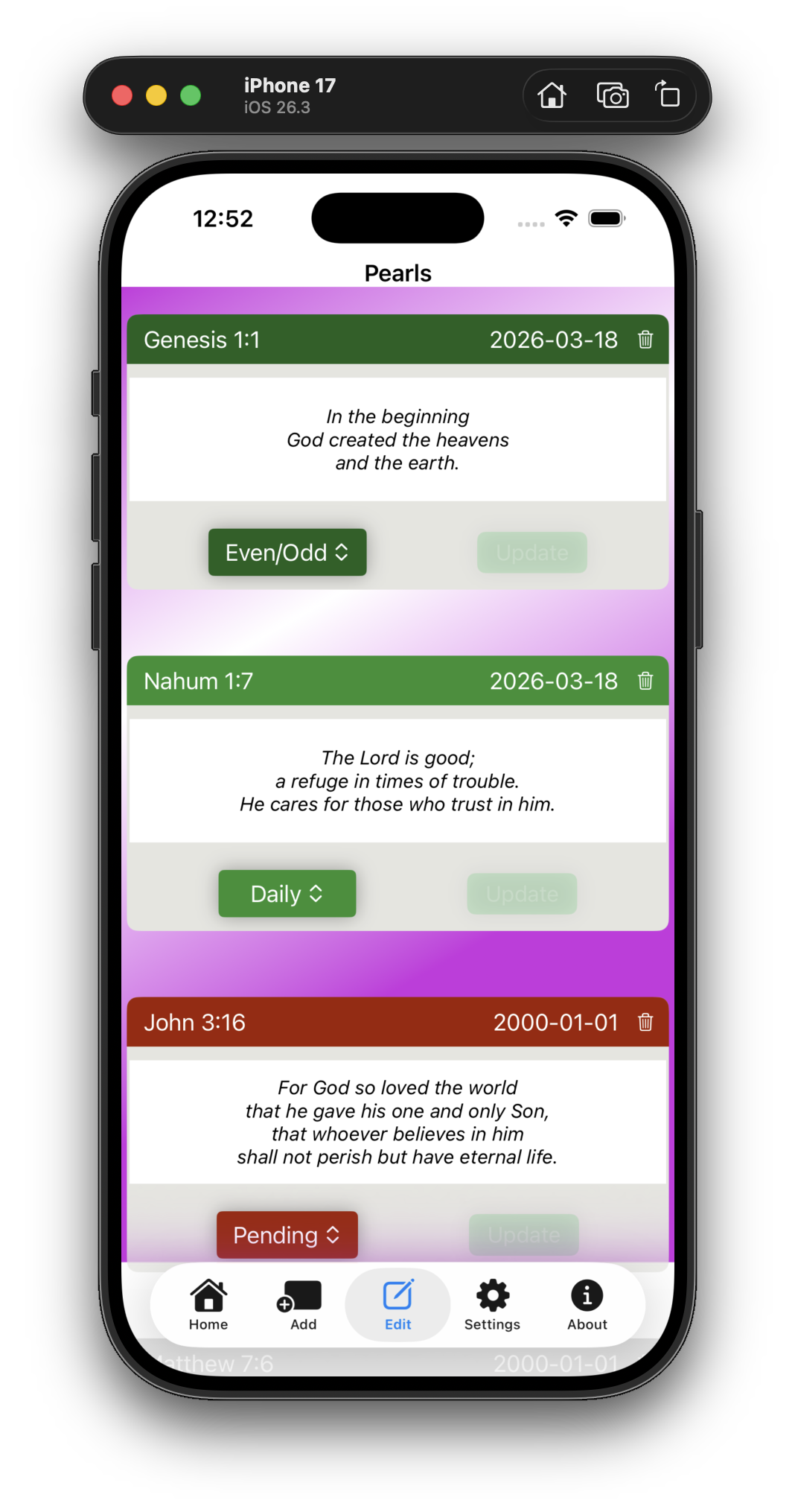 Pearls is an iPhone and Android app used to help memorize scripture. It was inspired by the wonderful video hosted by Sonya Shafer cofounder of Simply Charlotte Mason where she explains how to Memorize Scripture in Just Five Minutes Each Day.